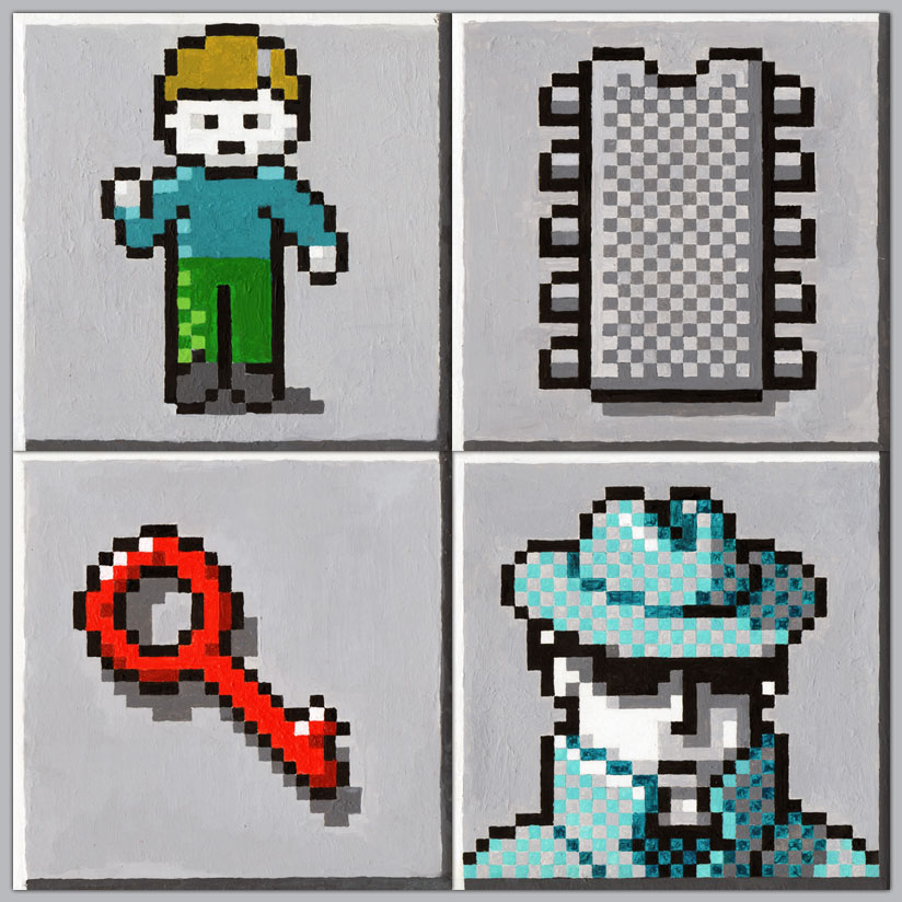 Re-creations of classic video game imagery. Acrylic paint on 4″ ceramic bath tiles.
