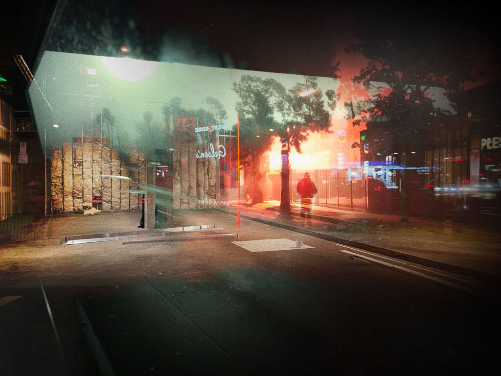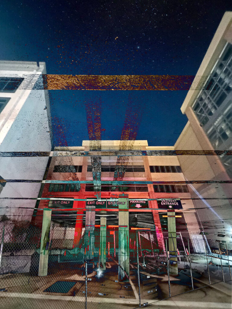 Night Drift Digital Collage, 2026. Composites of cell phone photos I took during my nighttime walks through West Los Angeles in the winter of 2025. “Moms and More” “Vacancy” “We Have to Start Over” “Long Gone” “No Trespassing” “Vice” “Double Fission”